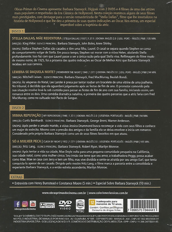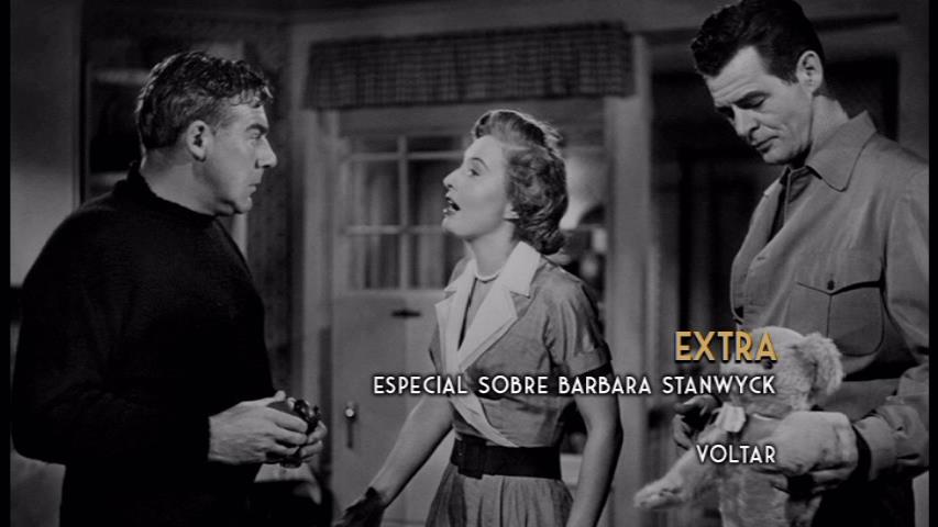 - Especial Sobre Barbara Stanwyck (10m18s):Biografia produzida especialmente pela distribuidora OP, comentando a carreira da atriz e seus principais filmes, ilustrado com imagens de pôsteres, fotos de arquivo e clipes de filmes. Bem informativo, poderia melhorar a locução, mas fica aqui o elogio por produzir um material original informativo.